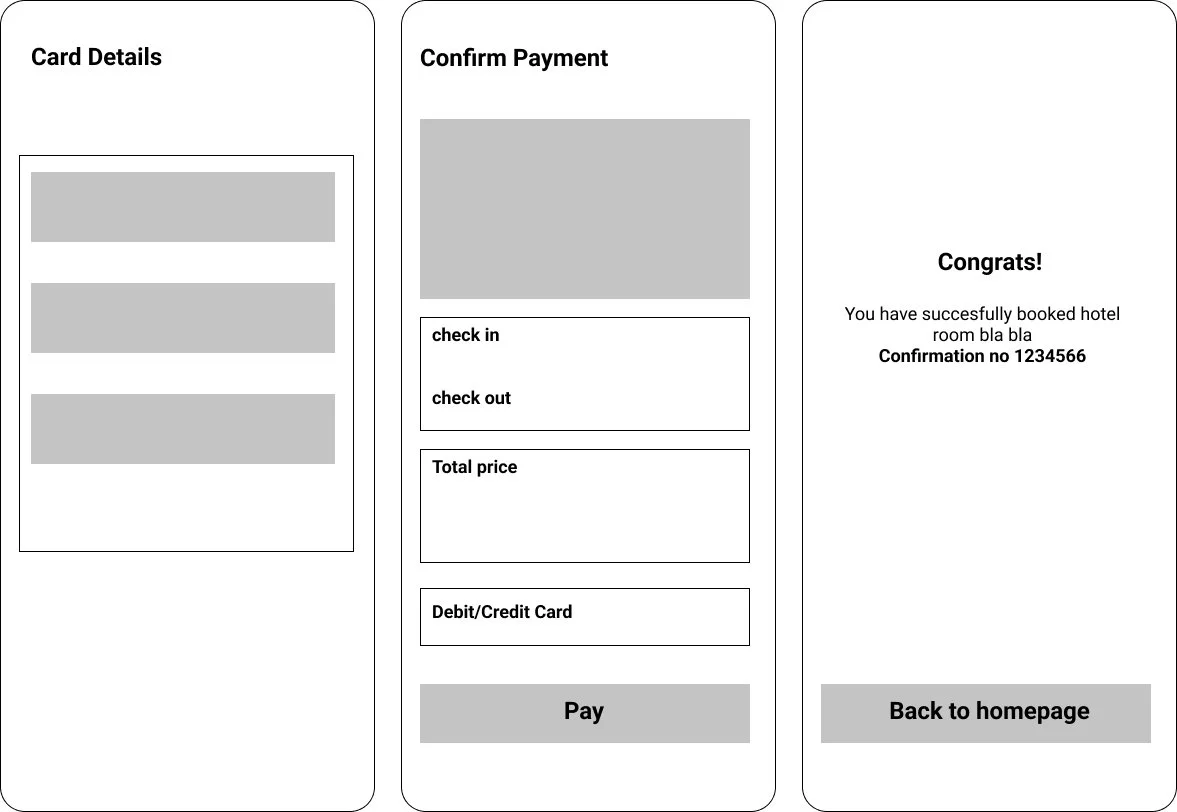 Our research examined popular hotel booking apps such as Hotels.com and Booking.com, revealing common issues like information overload and more apparent page structures. To corroborate our findings, we surveyed 17 participants who echoed similar problems, including unclear information, excessive steps, and inaccuracies in these apps. Based on these insights, we moved forward to create low-fidelity wireframes for our hotel booking app, using our research as a foundation for the design.