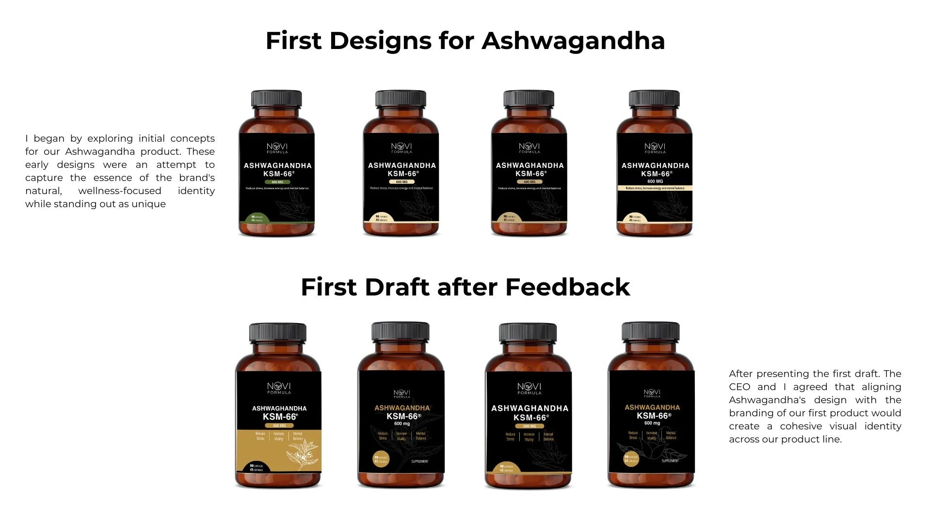 During my time with Novi Formula, I began as a Digital Designer intern and transitioned into a collaborative partner. I played a central role in branding, design, and marketing initiatives, contributing to the success of key products like "Stay Sharp", a natural brain-boosting blend, and the Ashwagandha product.